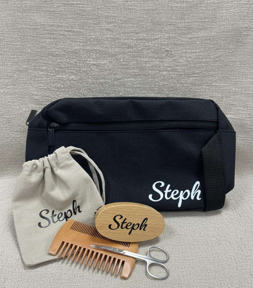 - Un petit pochon personnalisable comportant un kit complet pour la barbe : peigne, brosse et petit ciseau.